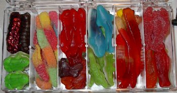 Tackle Box full of Gummy Fishing Lures. Worms, Minnows, Spiders, etc. An enjoyable for Fishermen and non -Fishermen alike.